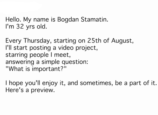 Nu stiam despre acest proiect video. Proiectul „Important”. Am aflat azi, cand am vazut un link la Monica Jitariuc pe Facebook. Nu il stiu nici pe autorul proiectului (dar cautand, am ajuns aici), nici pe Monica care a fost chestionata azi despre Ce e important pentru ea?