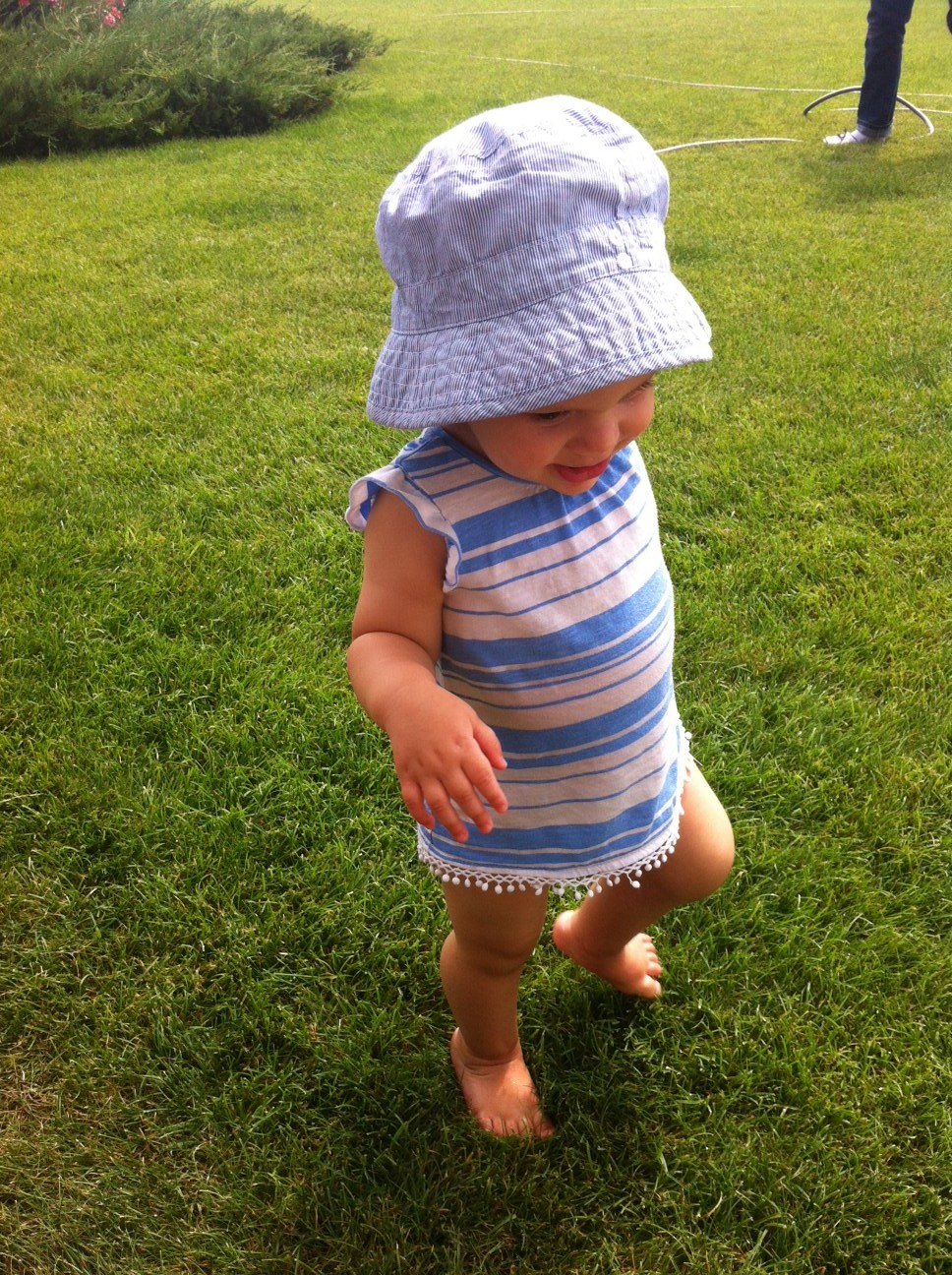 Ma uit la Zoe si nu imi vine sa cred ca merge. La 1 an si aproape o luna a inceput usor-usor sa se desprinda de masa din sufragerie si sa faca un pas, doi pana la canapea. Un pas-doi a tot facut cateva zile. Dupa care si-a dat drumul. Am lipsit pentru prima data 4 zile de acasa, am lasat-o cu matusa si bunica si cand ne-am intors facea deja vreo 20 de pasi. Si uite asa, la 1 an si 2 luni, fix azi, 9 august, merge in toata regula. Cade, dar rar. Si mai mereu in fund. Se ridica si continua. E fericita ca merge. Se vede pe fata ei ca se plimba si isi misca picioarele cu toata placerea. Suntem la bunici si are spatiu de desfasurare. Profita de asta si merge prin iarba tot timpul in care e treaza. Se duce la poarta, urca scarile, se plimba pe terasa, intra in casa, iese pe cealalta terasa, coboara scarile (sau intinde mana dupa ajutor), iar o ia prin iarba, se opreste, ne cauta privirile si iar si iar o ia din loc. Radiaza de fericire, chitaie, se bucura cand mareste pasul, apoi deodata se opreste si din nou repede inainte, cu piciorusele ei drepte si frumoase. Nu mi-am imaginat-o mergand. Eram curioasa cum va fi dupa mersul de cateva luni bune de-a busilea. Ma gandeam la cazaturi mai dese. Dar hotararea pare sa ii fie mare si echilibrul vine de la sine.