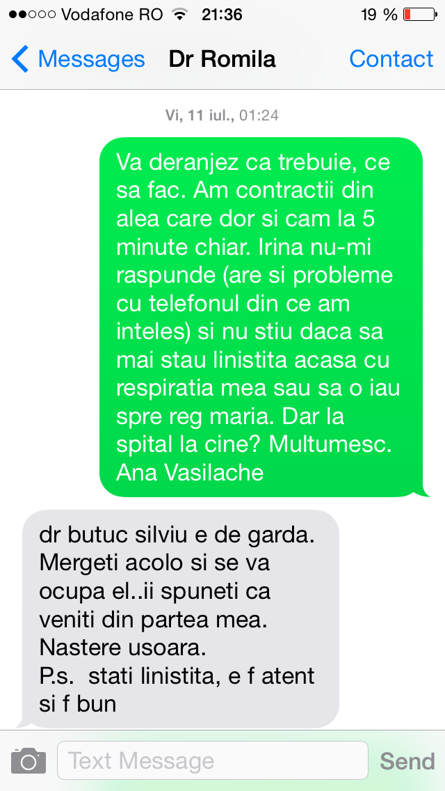 Nu stiu nici cum ar fi fost daca nasteam in alta parte. Cum ar fi fost cu medicul meu. Cum ar fi fost daca nasteam tot in Constanta. Nu stiu, nu stiu, nu stiu. Ce stiu sigur e ca ala a fost un moment din viata in care puterea mea s-a dus pe apa sambetei, s-a inecat de-a binelea si-a tras dupa ea si toata vointa si dorinta si totul s-a transformat in frica. Ma gandesc si acum ce linistita eram pe canapea, la mine acasa, cu cateva ore inainte, cu gandul ca cineva o sa imi raspunda la telefon si o sa nasc asa cum vreau. Eram mandra de corpul meu. Asta pana sa ma dezamageasca mintea.