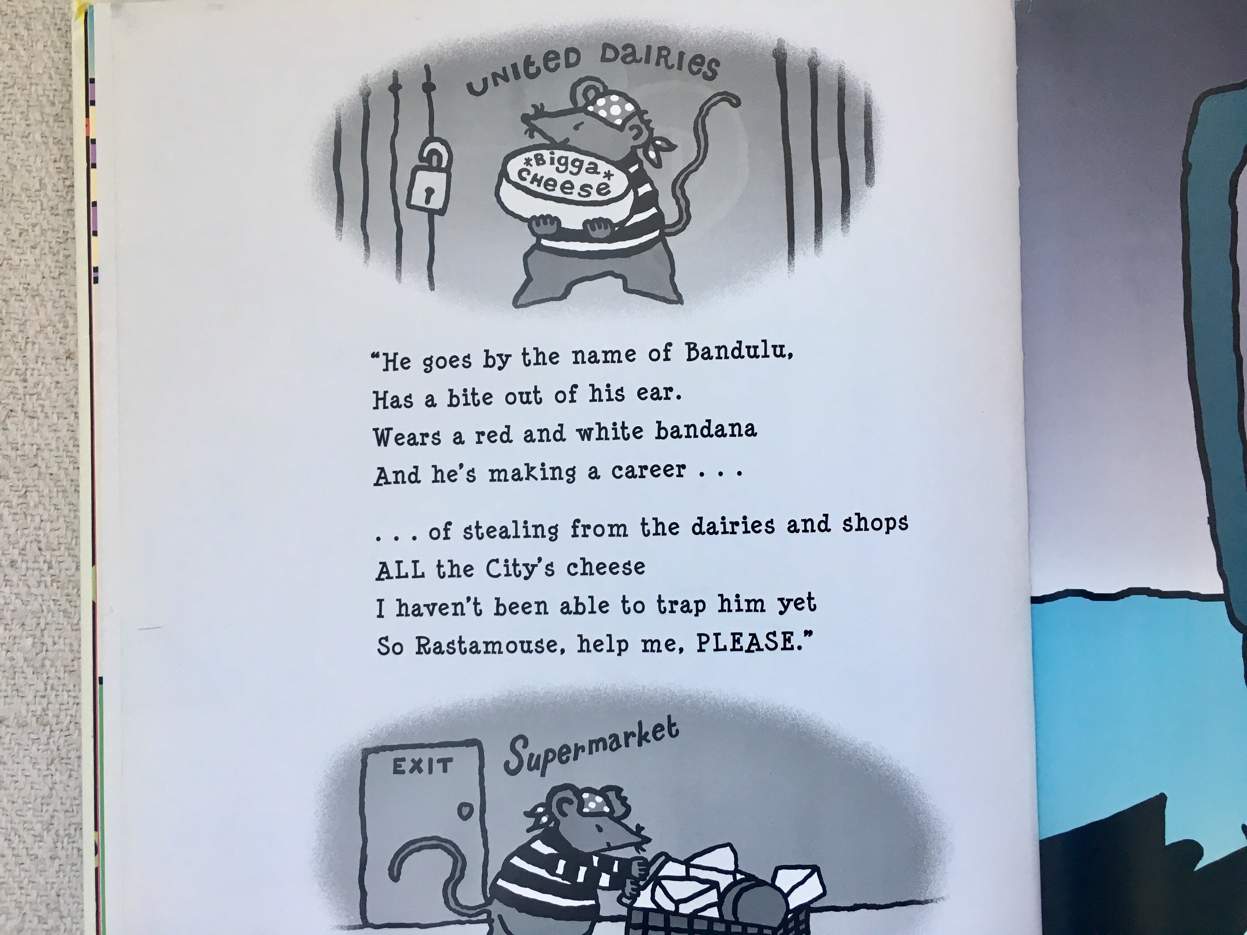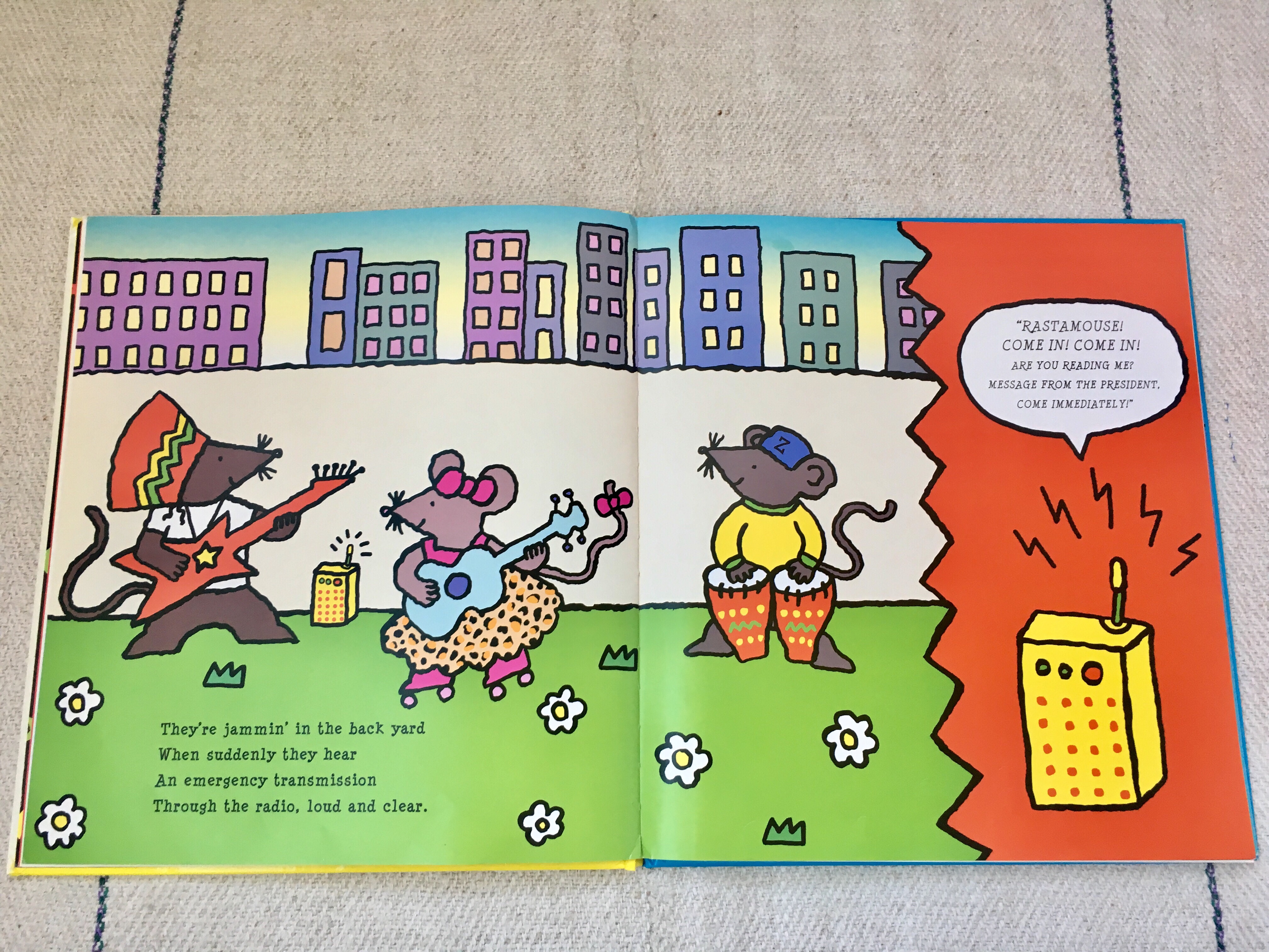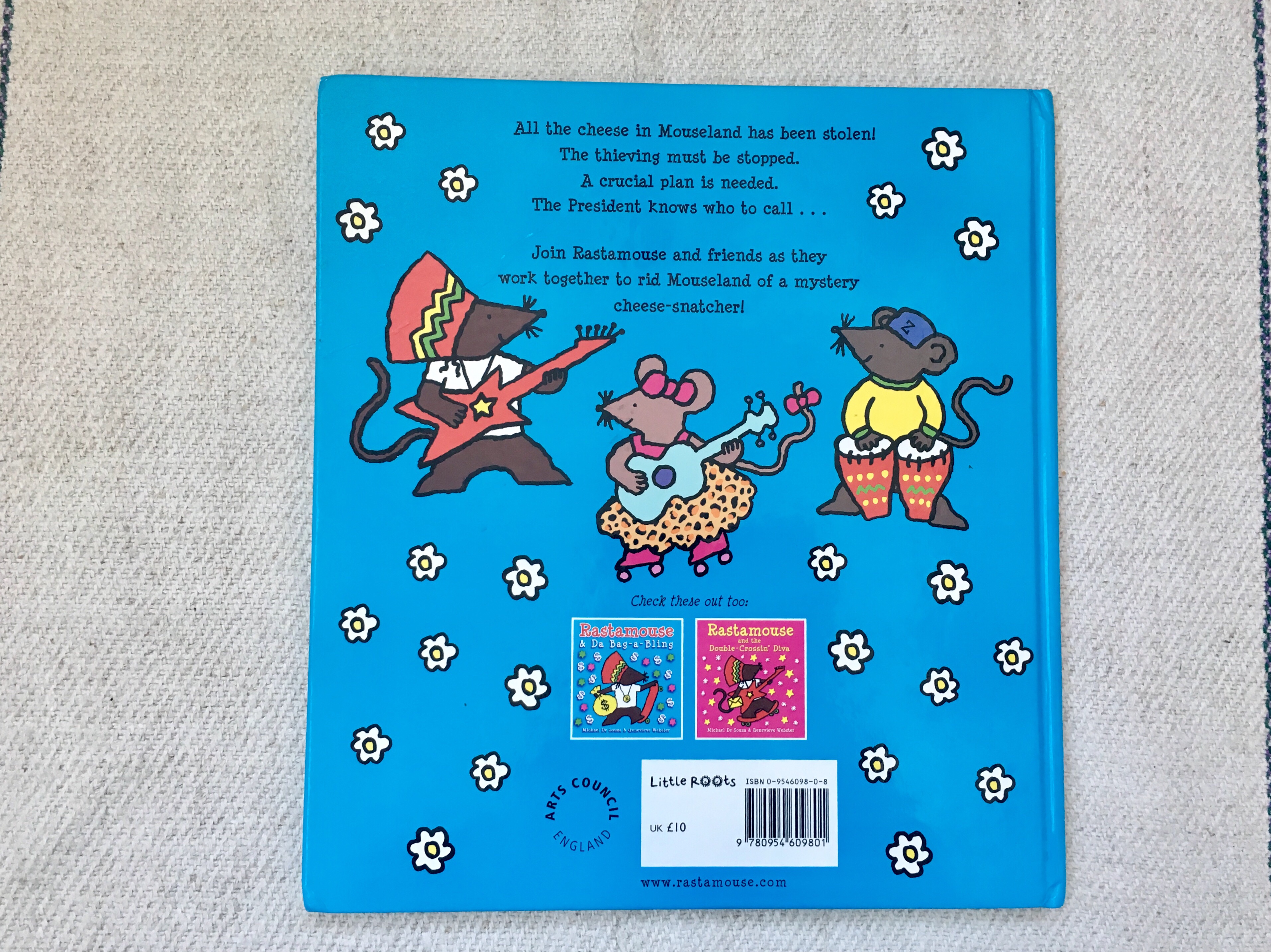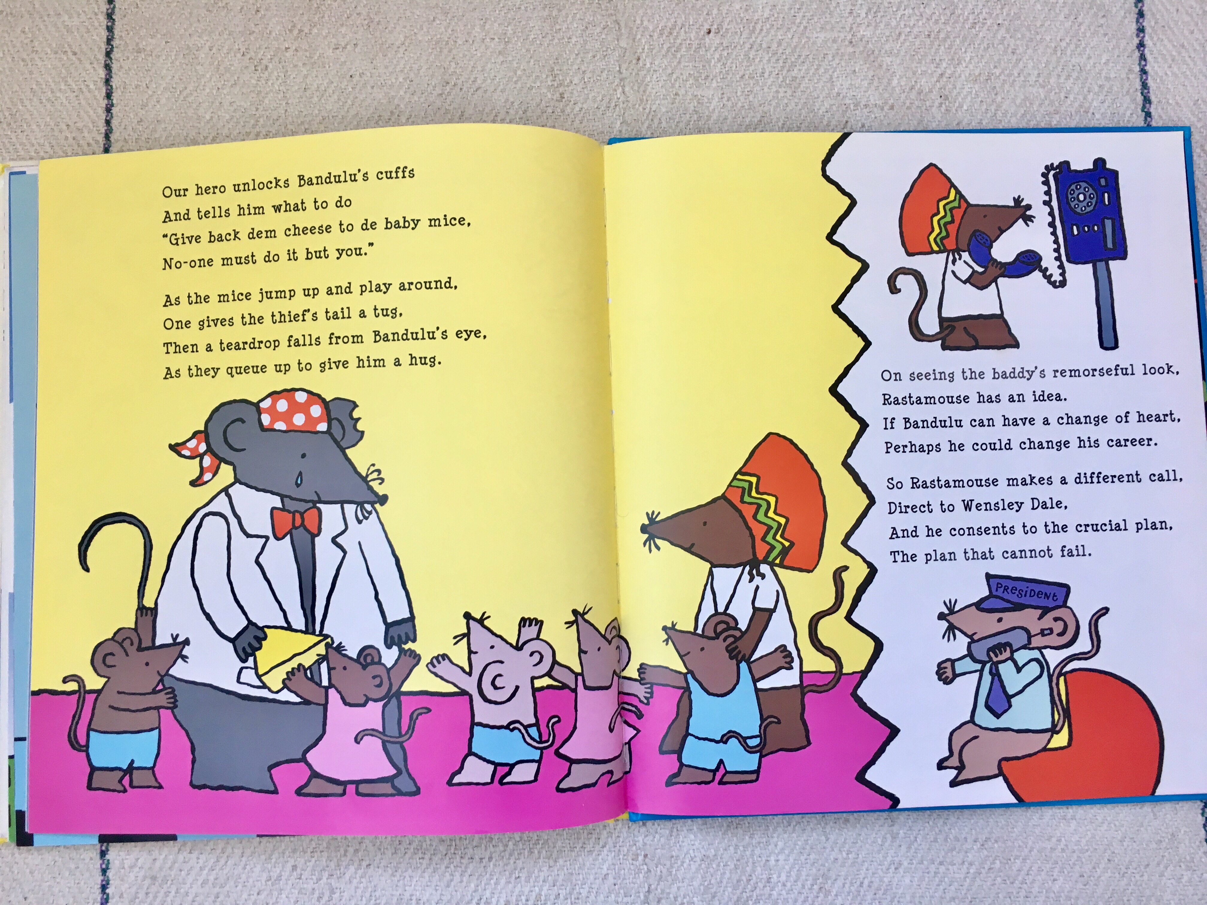 E o poveste în versuri, cu o rimă semi încrucișată (nope, n-am uitat), rimează de obicei al doilea vers cu al patrulea, șoriceii își promovează naționalitatea, Rastamouse are o căciulă în culorile naționale ale Guyanei (Guyana din Caraibe, am căutat), instrumentele lor muzicale au culori asemănătoare, la fel și paginile cărții. Cuvintele, unele, împrumută și ele din accentul local, mai ales la final, când povestea se termină cu mesajul președintelui: „irie, man”, irie însemnând un fel de alright.