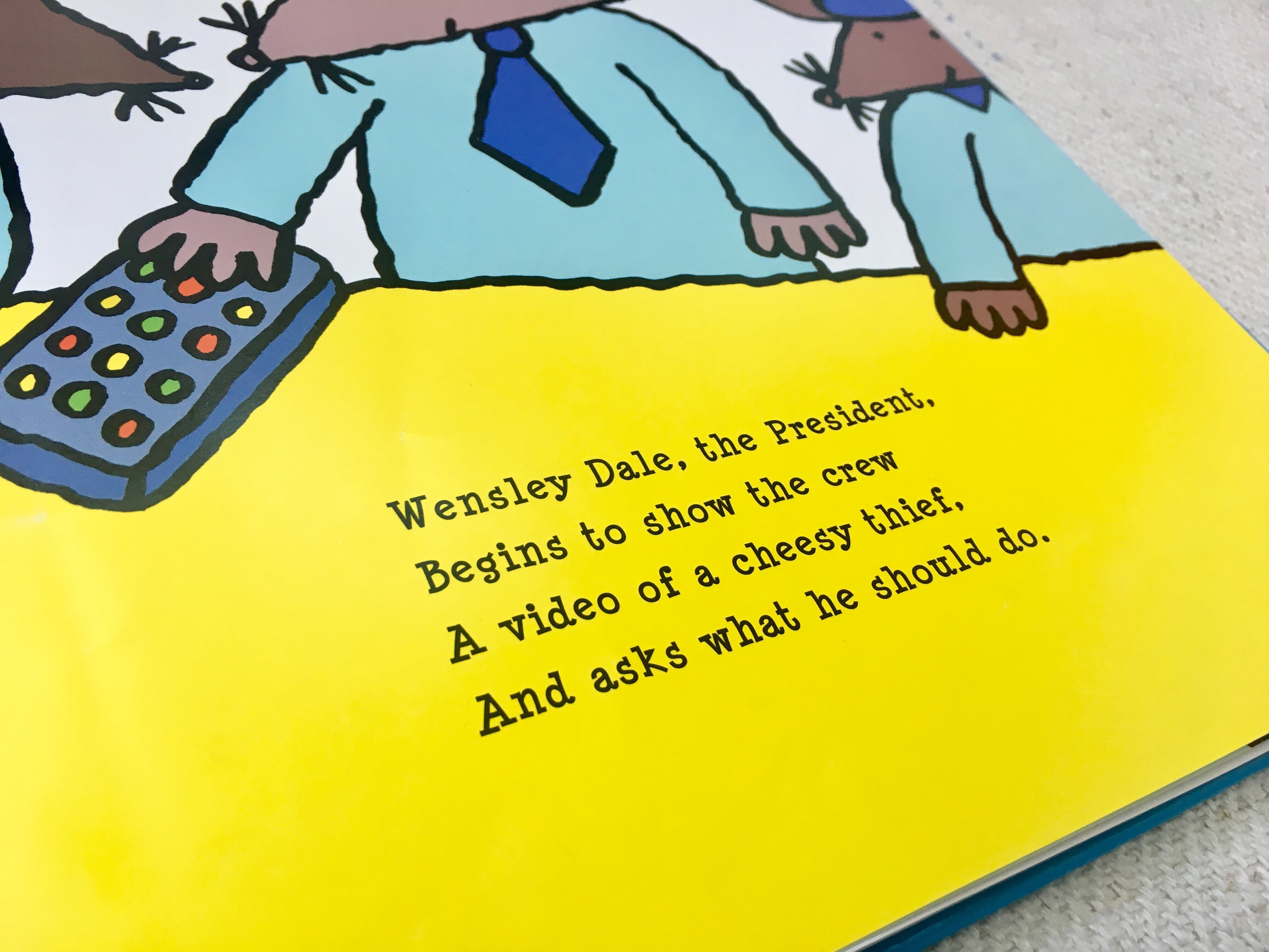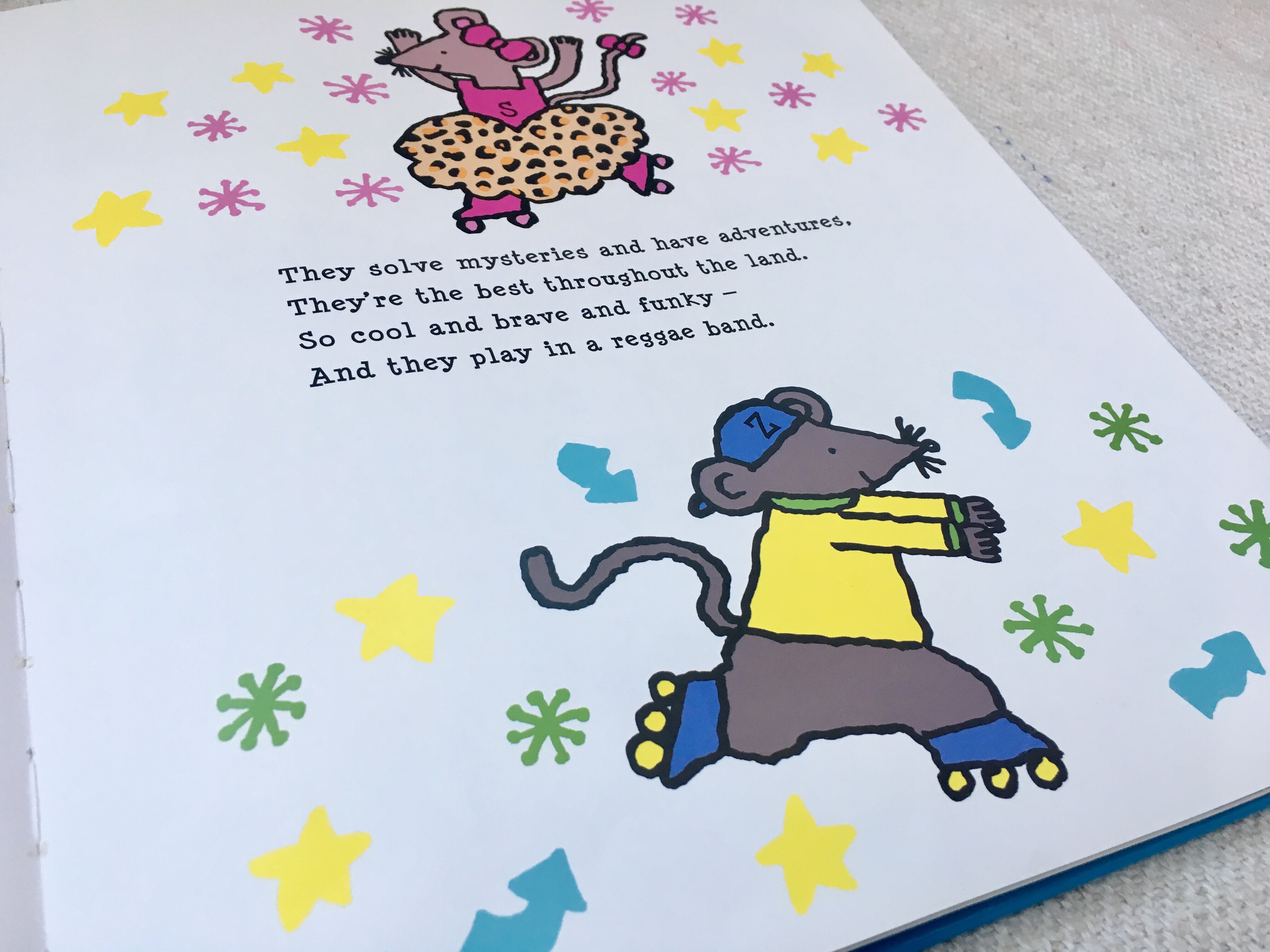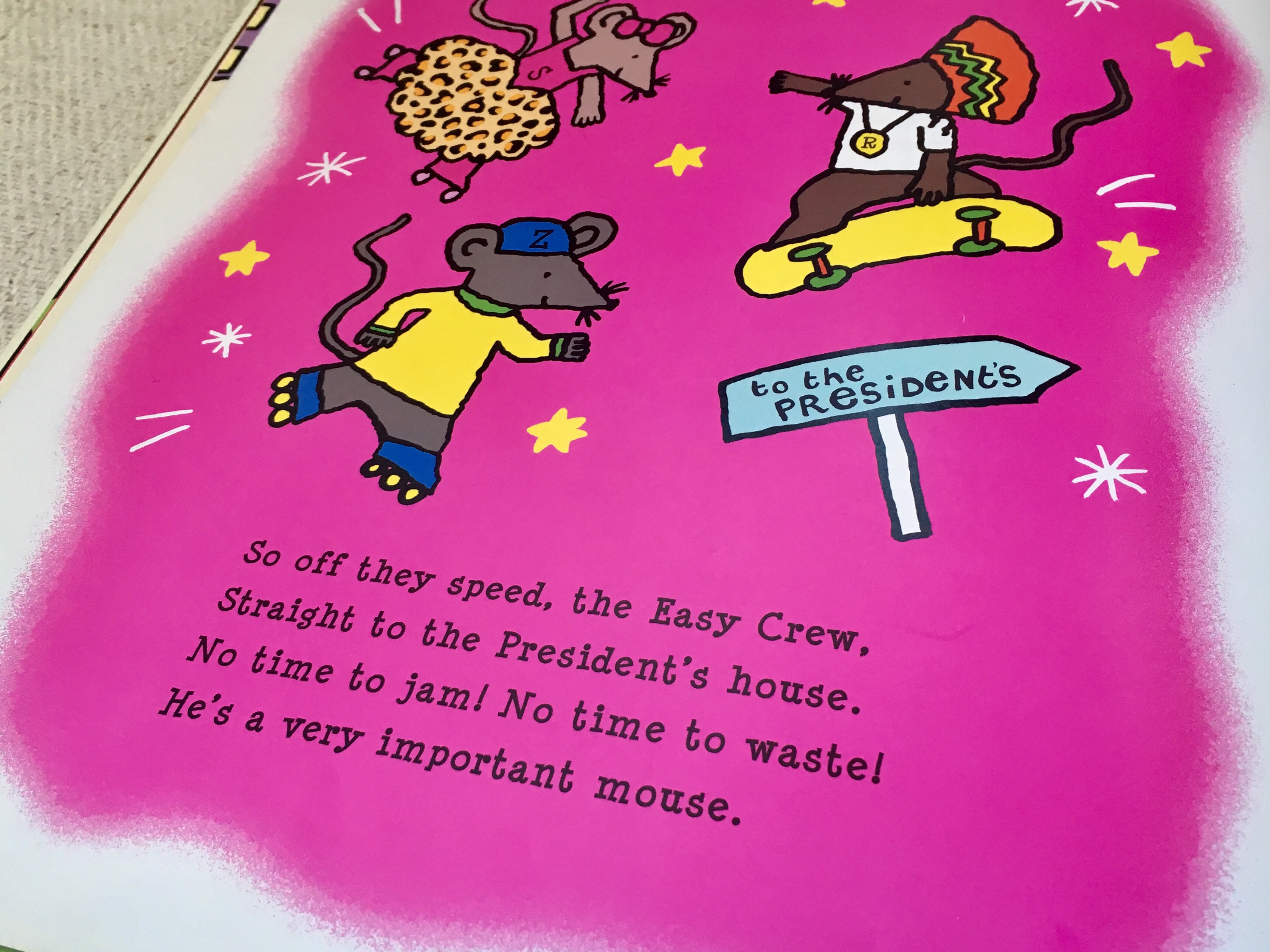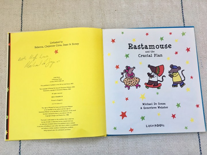 E o poveste în versuri, cu o rimă semi încrucișată (nope, n-am uitat), rimează de obicei al doilea vers cu al patrulea, șoriceii își promovează naționalitatea, Rastamouse are o căciulă în culorile naționale ale Guyanei (Guyana din Caraibe, am căutat), instrumentele lor muzicale au culori asemănătoare, la fel și paginile cărții. Cuvintele, unele, împrumută și ele din accentul local, mai ales la final, când povestea se termină cu mesajul președintelui: „irie, man”, irie însemnând un fel de alright.