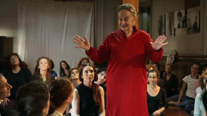 Pe 29 aprilie, în Ziua Internațională a Dansului, am văzut acest film la Linotip (după care am dansat în spațiul lor, pe muzica pusă de ei, nestingherită de nimic, nici de corp, nici de alți oameni, nici de încălțăminte). Am stat în primul rând, cu ochii aproape lipiți de ecranul care era la cel puțin 20 de m depărtare. Am urmărit, îndeaproape, mișcările lente, pricepute și firești ale Mariei. Mișcări pe care le face singură, în sală sau însoțită de mai mulți sau mai puțini participanți la curs. Mâinile i se plimbă în jurul gâtului, sânilor, bazinului. Și corpul ei se plimbă printre tineri și bârne, umple spațiul, respiră prin mișcare.