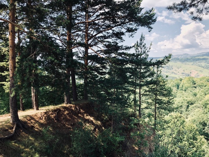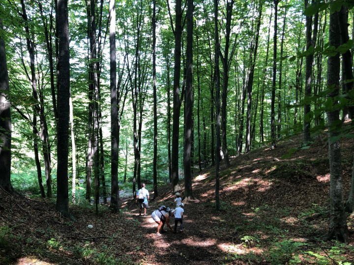 Coborâm, mergem pe aproximativ același traseu marcat cu roșu, fetele aleargă de mână cu bunica lor, Radu e ghidul, eu sunt codașa. Nu mă deranjează, am băț de sprijin, am și eu un copil cu mine, și nu oricare, ci al treilea, am ochelari de soare, deși nu sunt ai mei. Le zic că datorită mie au spatele asigurat, dar stând așa, la urmă, numai eu știu cum lasă pădurea în urmă: liniștită, puțin scăldată în soare și puțin-puțin mai curată (cu câteva sticle de plastic și pachete de țigări goale, în minus).
