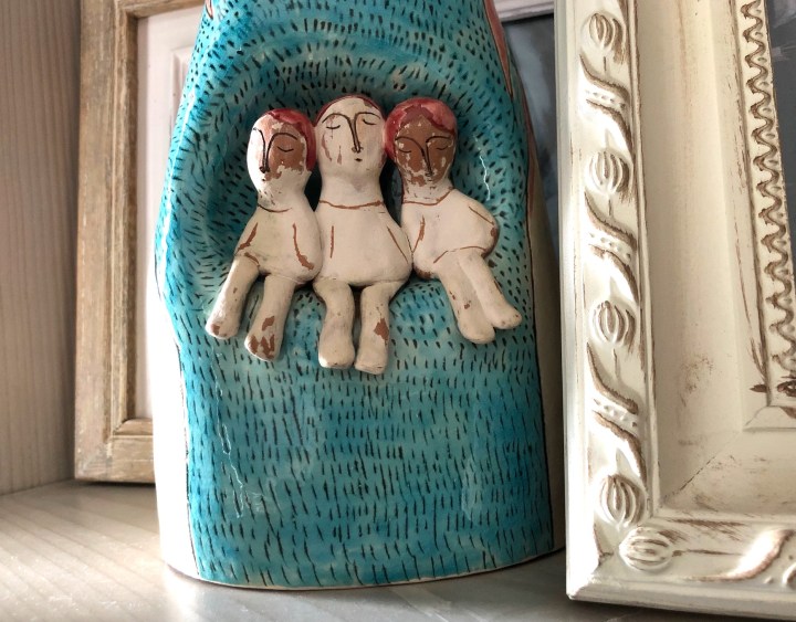 Păpușa cu frați, în care mama, adică eu, eram păpușa și frații erau de fapt surori, este o sculptură din ceramică glazurată, pe care am primit-o acum două zile. Posibil cel mai frumos cadou primit vreodată, în viață. Sau de când sunt mamă. Numele autorului este Alexandru Ariciu, nu-l cunosc, dar mă bucur că a gândit acest obiect pe care eu l-am primit în postura mea de mamă. Pe site-ul galeriei este prezentat așa: „figura protectoare a părintelui este reprezentată printr-un personaj feminin cu trăsături ce transmit o liniște copleșitoare. Desenul de inspirație bizantină este transpus pe suprafața ceramică printr-o grafie ireproșabilă a liniei. Ochii larg deschiși descriu o lume interioară marcată de griji, răbdare și o bucurie nemărginită. Figura maternă preia înfățisarea unui copac sau a unei flori ce susține prin forța naturală nașterea vieții.”