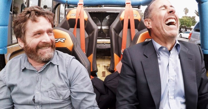- Jerry e relaxat, vorbește relaxat, nu e nici o presiune, nici o obligație, se simte bine, conduce mașini alese de el, ajunge în locuri diferite, bea multă cafea (așa cum îi place). Se amuză cu Ricky Gervais, îl aprobă pe Dave Chappelle, râde cu Chris Rock (cu toți râde, desigur, dar îl știți și voi pe Chris Rock cum vorbește, nu poți să nu râzi sau să zâmbești în fiecare secundă), vâslește cu Jimmy Fallon, în timp ce stă în pantaloni scurți de înot în față lui, îl ascultă interesat și mereu uimit pe Jim Carrey, descoperă în SJP o altă obsedată de detalii, îl lăuda pe Jerry Lewis, face două emisiuni cu Alec Baldwin, este suprins de Dana Cavey care îi pune o întrebare nemaipusa până atunci, rememorează tot soiul de întâmplări cu colegii din Seinfeld, îi da sfaturi lui Tracy Morgan, și, și, și, și…este oleacă emoționat de Obama. Fiecare episod este o sursă de amintiri, de joacă și de umor și de citate.