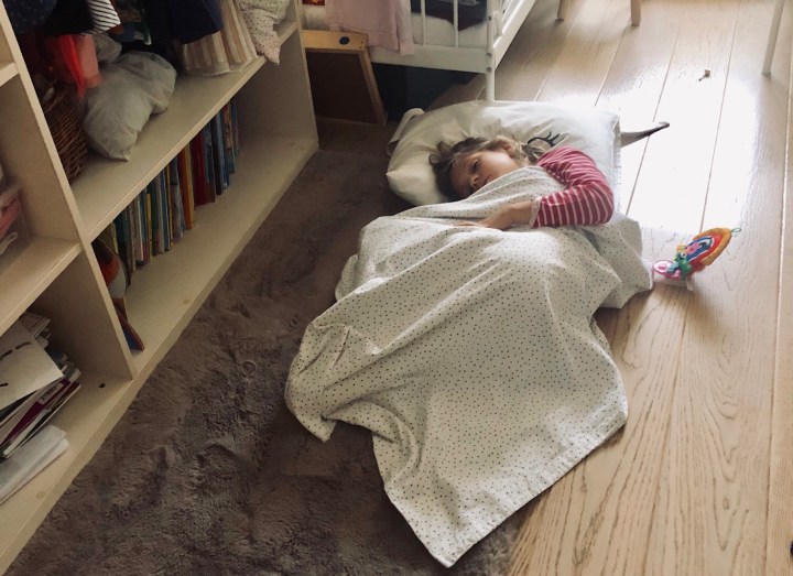 În fotografie e unul dintre copiii afectați, pe care eu l-am trimis totuși la școală (proastă mișcare) și l-am și luat în maxim două ore. Adormise pe covor, lângă mine, doar că eu mă ridicasem să mai vomit o dată. Și să fac poza.