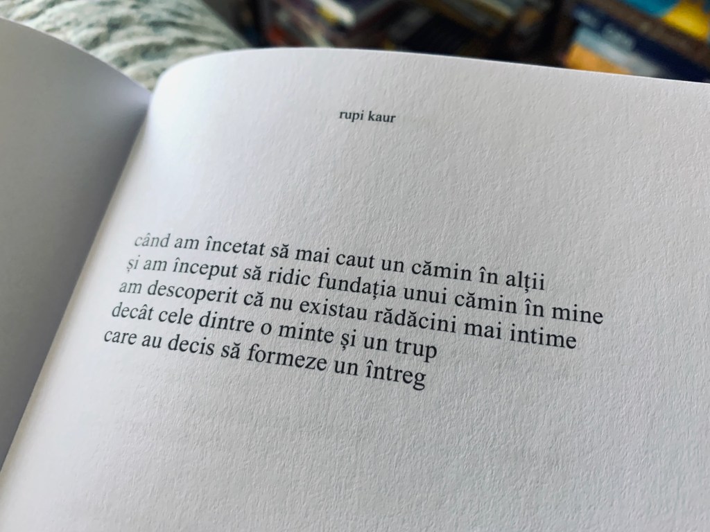 Rupi Kaur e foarte interesantă. Poezia ei e foarte interesantă. E scrisă fără litere mari și deci fără litere mici. Toate literele sunt tratate la fel. Teoria și gândurile ei despre asta sunt pe pagina ei. Rupi Kaur are două cărți de poezie publicate, până acum. Lapte și miere și Soarele și florile ei, apărute în această ordine. Și apariția lor în lume are o poveste, pentru că și-a publicat-o singură pe prima, iar ulterior a fost contactată de către o editură. Rupi Kaur scrie texte care iau forma unor poezii. Sunt texte de un rând, de două, de douăzeci. Sunt niște gânduri care se transformă în concluzii sau în scrisori sau în declarații sau în mesaje de revedere, de despărțire, de vindecare, de împăcare cu sine sau cu lumea. Dintre cele două cărți, am apreciat-o mai degrabă pe a doua. Mi-a mers mai bine la suflet. Am folosit mai multe post-it-uri, m-am oprit mai des asupra unor cuvinte și formulări. Am închis cartea mai des, ca să mă gândesc la ele, să îmi dau seama ce simt când le citesc, cred că așa se întâmplă de obicei cu textele care-ti scormonesc și în creier și în suflet. Textele ei, poezii sau ce or fi, sunt povești. Și cine nu iubește o poveste, chiar dacă are doar un rând. O poveste poate fi si un cuvânt.