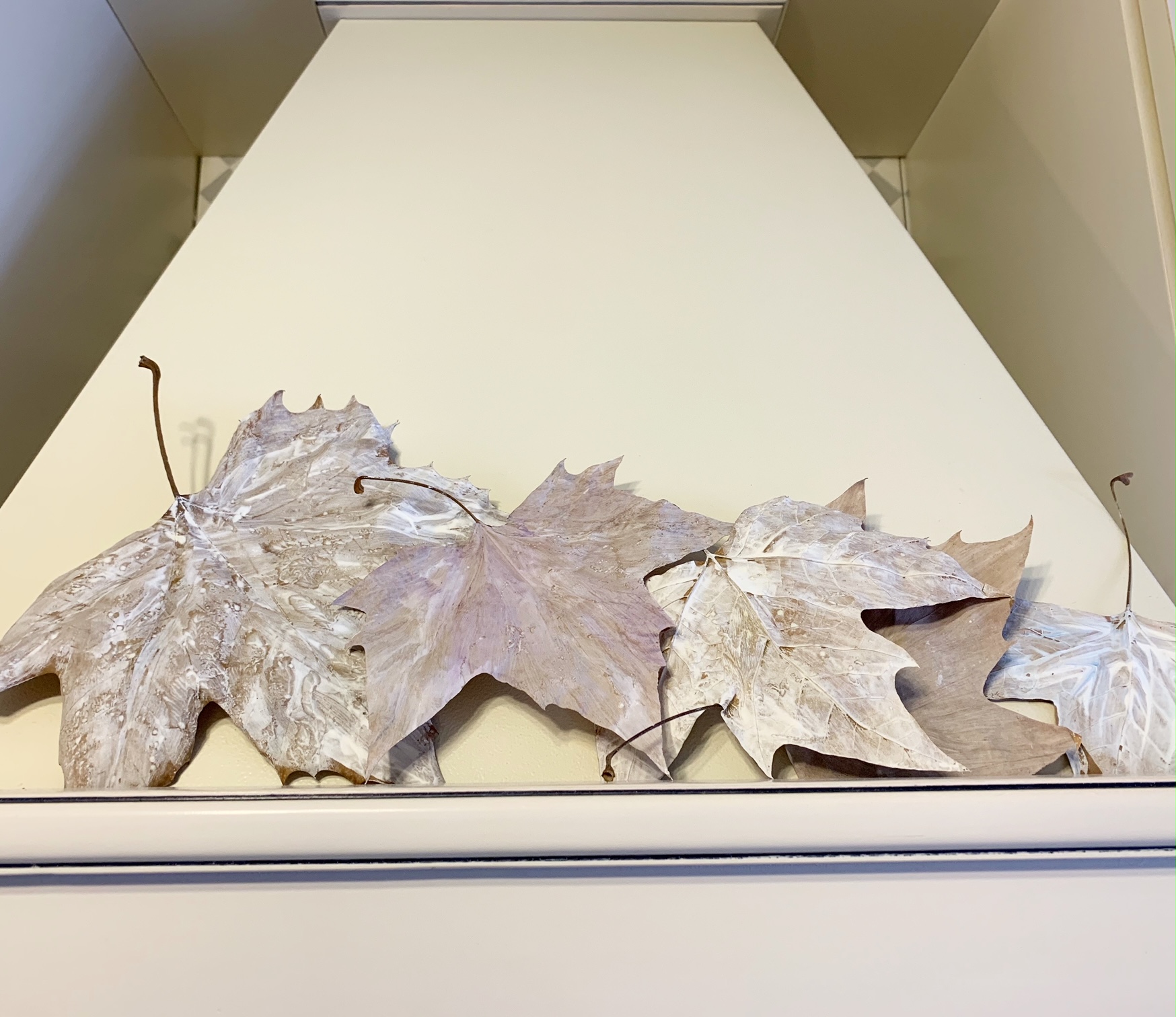 - Marți – 1 Decembrie – Facem decorațiuni de Crăciun pentru casă bunicilor (pentru că ne aflăm în vizită la ei). Ne-am propus niște conuri pictate cu alb, niște fulgi din hârtie, apoi am ajuns la o vânătoare de comori nefinalizata, că să încheiem de fapt cu frunze vopsite, așa că am pictat vreo jumătate de oră, întâi cu Kira, apoi și cu fețele mari, toate frunzele pe care le-am cules din curtea bunicilor. Dacă n-am fi depăsit oră mesei și nu trebuia să o culc pe Kira, am mai fi pictat lejer cel puțin jumătate din frunzele căzute pe pământ.