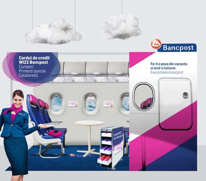 Bancpost a participat la Târgul de Turism cu o parte dintre aceste materiale și acest stand, nu pentru că au vreun departament de curse interne sau externe, ci pentru că au un card cu niște oferte și reduceri foarte bune pentru călători. Un card Bancpost Wizz.